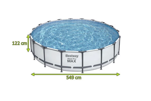 Der Steel Pro MAX kann mit einer Größe von ca. Ø 549 x 122 cm mit maximal 23.062 Litern gefüllt werden und bietet so für mehrere Personen ausreichend Platz. Durch das spezielle DuraPlus Material des Herstellers ist der Pool belastbar, strapazierfähig und äußerst langlebig, so dass Sie viele Sommer den heimischen Badespaß genießen können. Das von außen, einmal komplett um den Pool gehende PVC-Band sorgt für extra Stabilität der Seitenwände. Mit im Lieferumfang enthalten sind neben der Filterpumpe, eine passende Filterkartusche, die benötigten Schlauchverbindungen, eine stabile Sicherheitsleiter, eine PVC-Abdeckplane und ein selbstklebender Reparaturflicken.