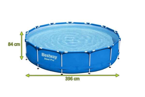 Der Steel Pro kann mit einer Größe von ca. Ø 396 x 84 cm mit maximal 8680 Litern gefüllt werden und bietet so für mehrere Personen ausreichend Platz. Durch das spezielle TriTech Material des Herstellers ist der Pool belastbar, strapazierfähig und äußerst langlebig, so dass Sie viele Sommer den heimischen Badespaß genießen können. Das von außen, einmal komplett um den Pool gehende PVC-Band sorgt für extra Stabilität der Seitenwände. Mit im Lieferumfang enthalten sind neben der Filterpumpe, eine passende Filterkartusche, die benötigten Schlauchverbindungen und ein selbstklebender Reparaturflicken.