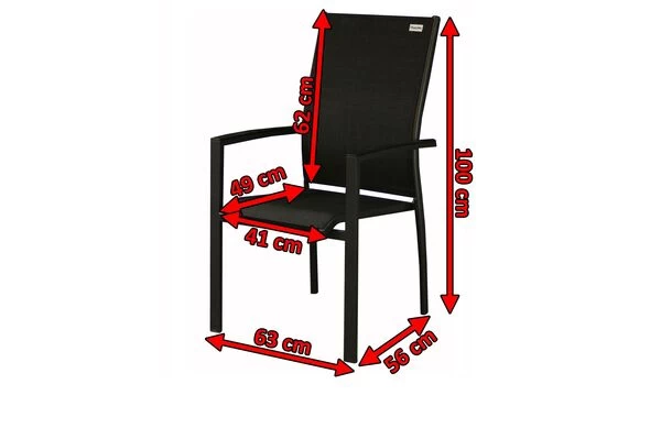 Der praktische Sessel überzeugt mit hochwertiger Verarbeitung und schlichtem Design. Das Gestell wurde aus pulverbeschichtetem Aluminium in der Farbe anthrazit angefertigt. Aluminium eignet sich dank zahlreicher positiver Eigenschaften ideal für die Herstellung von Outdoor-Möbeln. Sie können den Sessel unbesorgt das ganze Jahr im Freien stehen lassen. Durch die Pulverbeschichtung wird das Material stoß-, schlag- und kratzfest. Kombiniert wird das Gestell mit einer Sitz- und Rückenfläche aus Textilene in der Farbe schwarz. Das Kunststoffgewebe zeichnet sich durch eine hohe Belastbarkeit von bis zu ca. 100 kg aus. Zudem ist das Gewebe schnelltrocknend und pflegeleicht sowie frost- und hitzebeständig.