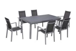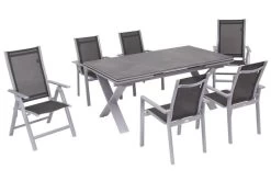 OUTFLEXX Esstischgarnitur, Silber, Alu / HPL / Textil, Tisch 180/280x100cm, 8 Multipositionssessel