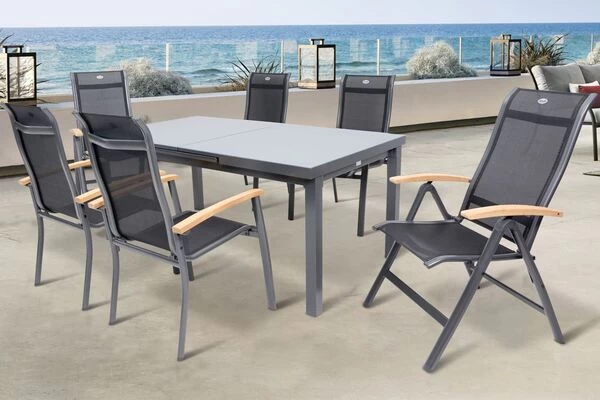 Die Sessel bestechen durch ihre schlichte Optik mit dem pulverbeschichteten Aluminiumrahmen in einem modernen Anthrazit in Kombination mit dem schwarzen Textilen-Gewebe. Ergänzt wird dieses zeitlose Design durch FSC-zertifizierte Teakholz-Armlehnen. Funktional überzeugen hier sowohl die Hochlehner, als auch die Stapelsessel. Die Rückenlehne der Hochlehner lässt sich kinderleicht mehrfach verstellen und bietet damit einen hervorragenden Sitzkomfort. Dank des pulverbeschichteten Aluminiumgestells sind alle Sessel zudem leicht und einfach zu transportieren. Je nach Bedarf können die Hochlehner zusammengeklappt und die Stapelsessel ineinander gestapelt, und somit platzsparend verstaut werden.