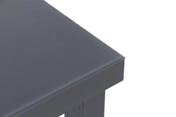 Seine besondere Optik verdankt er der Kombination aus der ca. 5 cm dicken Tischplatte aus Alu/Einscheibensicherheitsglas und dem anthrazitfarbenen Aluminiumgestell. Das ca. 5 mm dicke Sicherheitsglas überzeugt durch seine zahlreichen Vorteile und seine besondere Optik. Die geriffelte Tischplattenoberfläche sorgt dafür, dass das einfallende Licht nicht reflektiert wird und so ein matter Effekt entsteht. Der graue Siebdruck auf der Unterseite der Glasplatte sorgt für die graue Optik der Tischplatte. Das anthrazitfarbene Aluminiumgestell ist so hergestellt worden, dass es perfekt zu den anthrazitfarbenen Sesseln passt und die Artikel zusammen eine solide Esstischgruppe ergeben.