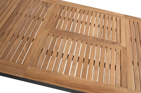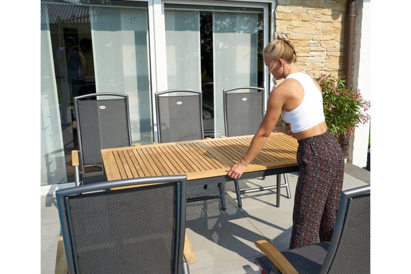 Der Hersteller setzt dabei, neben dem minimalistischen Design, vor allem auf besonders hochwertige Materialien. Diese sind dabei ebenso robust wie edel. Das beginnt schon beim stabilen Rahmen: Durch den Einsatz von Aluminium kann nicht nur die Optik überzeugen, sondern auch die hohe Robustheit. Der Gartentisch bietet mit seinen Maßen von ca. 160/220 x 90 cm bei einer Höhe von ca. 74 cm ausreichend Platz um gemeinsam schöne Stunden bei einem Brunch im Garten zu verbringen. Die Tischplatte besteht aus Teakholz und lässt sich durch einen geschmeidigen Butterfly-Auszug problemlos von ca. 160 cm auf ca. 220 cm verlängern, sodass Sie zahlreiche Plätze für Gäste schaffen. Die hochwertige Materialauswahl und die sorgfältige Verarbeitung sorgen nicht nur für die exklusive Optik dieses Ausziehtisches, sondern machen den Tisch auch sehr stabil. Genießen Sie mit gutem Gewissen entspannte Stunden im Garten. Die Tischleisten aus FSC-zertifiziertem Teakholz verleihen diesem Tisch einen ganz besonderen Charme. Darüber hinaus ist Teakholz besonders witterungsbeständig und hält sowohl Hitze und Frost, als auch Regen und Feuchtigkeit aus. Es hat außerdem aufgrund des hohen Anteils an holzeigenen Ölen einen natürlichen Schutz gegen Pilze und andere Schädlinge. Die Sessel von Hartman wissen durch die qualitativ hochwertige Verarbeitung und Stabilität zu überzeugen. Wegen der Armlehnen aus FSC-zertifiziertem Teakholz entsteht eine unverwechselbare Optik, die die Stühle zu einem echten Hingucker machen. Dank der vorteilhaften Stoffzusammensetzung der schwarzen 4×4 Textilenbespannung aus 70% Polyvinylchlorid und 30% Polyester profitieren Sie von einer langen Haltbarkeit. Sie werden gar nicht mehr aufstehen wollen, denn das witterungsbeständige Material ist durch seine Flexibilität auch ohne Auflagen sehr bequem. Das Gestell aus robustem Aluminium sorgt für ein geringes Eigengewicht von nur ca. 5,3 kg, sodass sich die Stühle kinderleicht verschieben oder an die gewünschte Position tragen lassen. Trotz des leichten Gewichts sind die Sessel äußerst stabil und können mit bis zu 130 kg belastet werden. Um Ihren Terrassenboden beim Verschieben zu schützen, verfügen die Füße über praktische Bodenschoner. Ob Sie beim Essen ganz aufrecht sitzen möchten oder sich in der Sonne zurücklehnen wollen um zu entspannen, Sie finden immer die richtige Sitzposition. Ebenso schnell und unkompliziert können Sie die Stühle zusammenklappen und platzsparend verstauen.