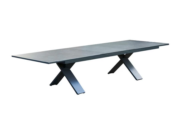 Das gekreuzte Tischgestell ist gefertigt aus pulverbeschichtetem Aluminium in der Farbe Xerix (Anthrazit) und wird optisch perfekt durch die Glaskeramik-Tischplatte, ebenfalls in der Farbe Xerix ergänzt. Die Maße von ca. 220 x 100 x 75 cm sorgen dafür, dass stets ausreichend Ablagefläche zur Verfügung steht. Bei Bedarf kann der Tisch auf eine Länge von ca. 280 cm ausgezogen werden, so finden bequem auch große Runden genügend Platz in Ihrem Garten. Dank der Ausziehfunktion hebt sich dieses Modell von den üblichen Tischen der Xanadu Serie ab – den Ausziehtisch erhalten Sie exklusiv bei uns. Die verwendeten Materialien sind extrem witterungsbeständig und pflegeleicht, weshalb der Tisch auch bei schlechtem Wetter ohne Probleme auf Ihrer Terrasse stehen bleiben kann. Außerdem ist das Aluminium ziemlich unempfindlich und hält spielend Kälte und Frost stand. Die Tischplatte aus dem Glas-Keramik-Gemisch ist stoß-, schlag- und schnittbeständig und somit ein idealer Begleiter im Familienalltag. Die Trägerplatte ist eine Platte aus Glas, auf die eine dünne Keramikschicht aufgetragen wird.