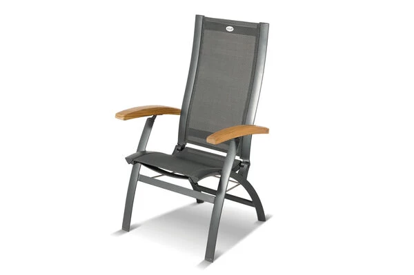 Die Multipositionssessel von Hartman wissen durch die qualitativ hochwertige Verarbeitung und Stabilität zu überzeugen. Dank der vorteilhaften Stoffzusammensetzung der Textilenbespannung in anthrazit aus 70% Polyvinylchlorid und 30% Polyester profitieren Sie von einer langen Haltbarkeit. Optisch stechen die Stühle durch durch das Detail der Teakholzarmlehnen heraus und runden die Optik des Sets in besonderer Weise ab. Sie werden gar nicht mehr aufstehen wollen, denn das witterungsbeständige Material ist durch seine Flexibilität auch ohne Auflagen sehr bequem. Das Gestell aus pulverbeschichtetem Aluminium in xerix sorgt für ein geringes Eigengewicht von nur ca. 10,7 kg, sodass Sie den Stuhl jederzeit verschieben und zwischen Sonne und Schatten wählen können. Trotz des leichten Gewichts ist der Multipositionssessel äußerst stabil und kann mit bis zu ca. 135 kg belastet werden. Um Ihren Terrassenboden beim Verschieben zu schützen, verfügen die Stühle über praktische Bodenschoner. Ob Sie beim Essen ganz aufrecht sitzen möchten oder sich in der Sonne zurücklehnen wollen, Sie finden immer dank der verstellbaren Lehne die richtige Sitzposition. Ebenso schnell und unkompliziert können Sie die Sessel zusammenklappen und platzsparend verstauen