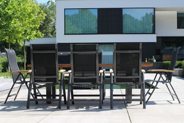 Die verwendeten Materialien sind extrem witterungsbeständig und pflegeleicht, daher können sie auch bei schlechtem Wetter ohne Probleme auf Ihrer Terrasse stehen bleiben. Die 4×4 Textilenbespannung (70% Polyvinylchlorid, 30% Polyester) in der Farbe Schwarz ist beständig gegen UV-Strahlung, sodass die Farben lange frisch aussehen. Außerdem trocknet sie nach einem kurzen Schauer sehr schnell. Teakholz und Aluminium sind besonders witterungsbeständig und halten sowohl Frost und Hitze als auch Feuchtigkeit und Regen aus. Teakholz hat aufgrund des hohen Anteils an holzeigenen Ölen einen natürlichen Schutz gegen Pilze und Schädlinge. So beschränkt sich die Pflege Ihrer neuen Gartenmöbel auf ein Minimum und Sie können Ihre Zeit im Garten mit angenehmen Tätigkeiten verbringen.