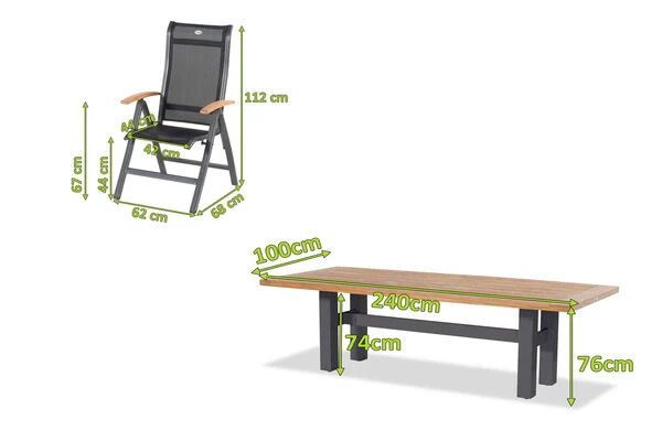 Bei dieser Esstischgruppe treffen hochwertige Materialien und Design auf modernste Weise aufeinander. Das Set besteht aus dem Esstisch „Yasmani“ mit den Maßen von ca. 240 x 100 x 77 cm und 8 Multipositionssesseln aus der „Alice“-Serie in der Farbe „Xerix“ (Anthrazit).
