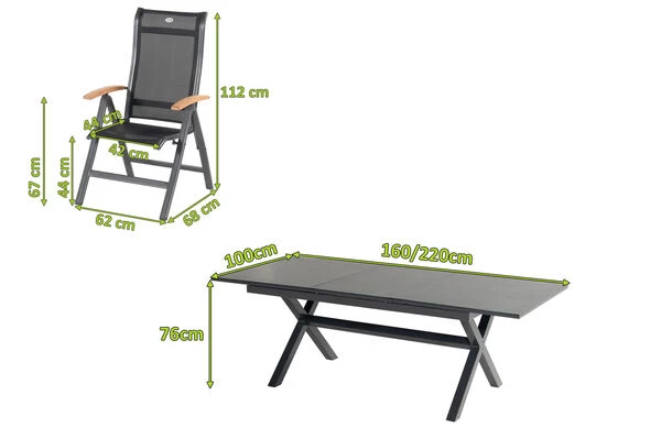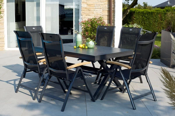 Das gekreuzte Gestell ist gefertigt aus pulverbeschichtetem Aluminium in der Farbe Xerix (Anthrazit) und wird optisch perfekt durch die Glaskeramik-Tischplatte, ebenfalls in der Farbe Xerix ergänzt. Die Maße von ca. 160 x 100 x 75 cm sorgen dafür, dass stets ausreichend Ablagefläche zur Verfügung steht. Bei Bedarf kann der Tisch auf eine Länge von ca. 220 cm ausgezogen werden, so finden bequem auch große Runden genügend Platz in Ihrem Garten. Dank der Ausziehfunktion hebt sich dieses Modell von den üblichen Tischen der Xanadu Serie ab – den Ausziehtisch erhalten Sie exklusiv bei uns.Die verwendeten Materialien sind extrem witterungsbeständig und pflegeleicht, weshalb der Tisch auch bei schlechtem Wetter ohne Probleme auf Ihrer Terrasse stehen bleiben kann. Außerdem ist das Aluminium ziemlich unempfindlich und hält spielend Kälte und Frost stand. Die Tischplatte aus dem Glas-Keramik-Gemisch ist stoß-, schlag- und schnittbeständig und somit ein idealer Begleiter im Familienalltag. Die Trägerplatte ist eine Platte aus Glas, auf die eine dünne Keramikschicht aufgetragen wird.Die Multipositionssessel von Hartman wissen durch die qualitativ hochwertige Verarbeitung und Stabilität zu überzeugen. Wegen der Armlehnen aus FSC-zertifiziertem Teakholz entsteht eine unverwechselbare Optik, die die Stühle zu einem echten Hingucker machen. Dank der vorteilhaften Stoffzusammensetzung der schwarzen 4×4 Textilenbespannung aus 70% Polyvinylchlorid und 30% Polyester profitieren Sie von einer langen Haltbarkeit. Sie werden gar nicht mehr aufstehen wollen, denn das witterungsbeständige Material ist durch seine Flexibilität auch ohne Auflagen sehr bequem. Das Gestell aus robustem Aluminium sorgt für ein geringes Eigengewicht von nur ca. 5,3 kg, sodass sich die Stühle kinderleicht verschieben oder an die gewünschte Position tragen lassen. Trotz des leichten Gewichts sind die Sessel äußerst stabil und können mit bis zu 130 kg belastet werden. Um Ihren Terrassenboden beim Verschieben zu schützen, verfügen die Füße über praktische Bodenschoner. Ob Sie beim Essen ganz aufrecht sitzen möchten oder sich in der Sonne zurücklehnen wollen um zu entspannen, Sie finden immer die richtige Sitzposition. Ebenso schnell und unkompliziert können Sie die Stühle zusammenklappen und platzsparend verstauen.