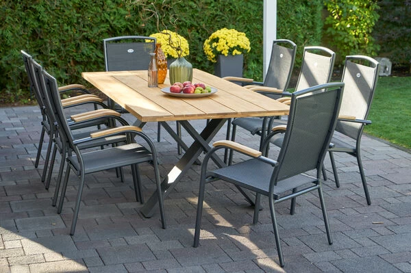 Modern und robust zugleich präsentiert sich diese besondere Esstischgarnitur aus dem Hause Hartman. Das Set besteht aus dem Gartentisch Xanadu und 8 Stapelsesseln Raffaelo.