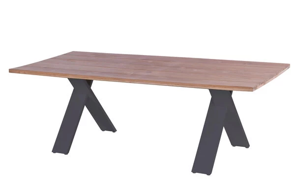 Der Tisch mit dem gekreuzten Gestell ist gefertigt aus pulverbeschichtetem Aluminium in der Farbe Xerix (Anthrazit) und wird optisch perfekt durch die Tischplatte aus SVLK-zertifiziertem Teakholz ergänzt. Die Maße von ca. 220 x 100 x 75 cm sorgen dafür, dass stets ausreichend Ablagefläche zur Verfügung steht und bequem 8 Personen genügend Platz finden.