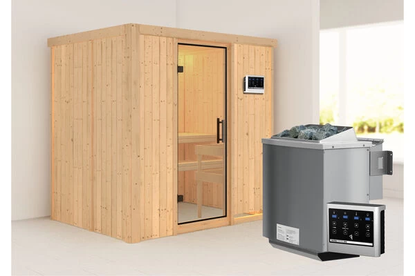 1x KARIBU Bodin Sauna, naturbelassen, Fichte, ca. 196 x 151 x 198 cm, Fronteinstieg, mit Klarglastür SET mit Ofen 4,5 kW Bio ext. Strg.