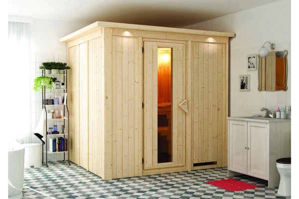 Die 68 mm Systemsaunen bestehen aus vorgefertigten Wandelementen, in die eine 42 mm Dämmschicht aus Mineraldämmwolle eingelagert ist. Die zwei Sichtseiten werden beidseitig aus senkrecht verarbeiteten Profilholz, die zwei anderen Seiten werden an den Rückwänden mit Hartfaserplatte verkleidet. Durch das extra gedämmte Dach und die Isolierglastür garantiert die Sauna einen niedrigen Energieverbrauch und sorg für ein angenehmes Raumklima.