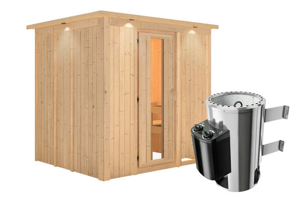 Energiespar-Sauna Eupin aus Fichtenholz mit Fronteinstieg und Dachkranz, naturbelassen in verschiedenen Ausführungen von KARIBU