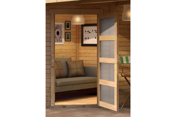 Das Gartenhaus Schwandorf aus nordischer Fichte von KARIBU wird aus 19 mm Wandbrettern im Steck-/Schraubsystem gefertigt und kann somit rasch und einfach aufgebaut werden. Das praktische Flachdach aus Massivholz sorgt dafür, dass das Gartenhaus schnell und wirkungsvoll gegen Witterungseinflüsse geschützt ist. Dank der Seitenhöhe von ca. 202 cm und einer Firsthöhe von ca. 218 cm sorgt das Haus innen für viel Platz. Kesseldruckimprägnierte Bodenbalken sorgen für optimalen Schutz gegen aufsteigende Feuchtigkeit. Durch die Positionierung unter dem Gartenhaus schützen die Bodenbalken effektiv vor Staunässe und Spritzwasser. Das Gartenhaus wird mit der, praktischerweise schon vormontierten Tür, im stabilen Massivholzrahmen ausgeliefert und bietet dank der großen Öffnung bequemen Zutritt in das Haus. Nebenbei bietet sie effektiven Schutz vor Diebstahl. Gleichzeitig lassen die großzügigen Lichtausschnitte im jeweiligen Türflügel ausreichend Tageslicht in das Gartenhaus einströmen.
