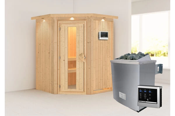 Sauna Larin aus Fichtenholz mit Eckeinstieg inkl. Energiespartür in verschiedenen Ausführungen von KARIBU