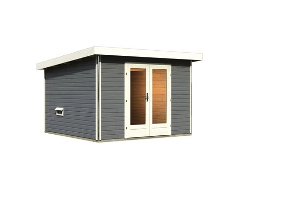 1 x KARIBU Mainburg 1 Saunahaus, terragrau, Fichte, 309x309x229 cm, SET 1 mit Doppelflügeltür und Vorraum