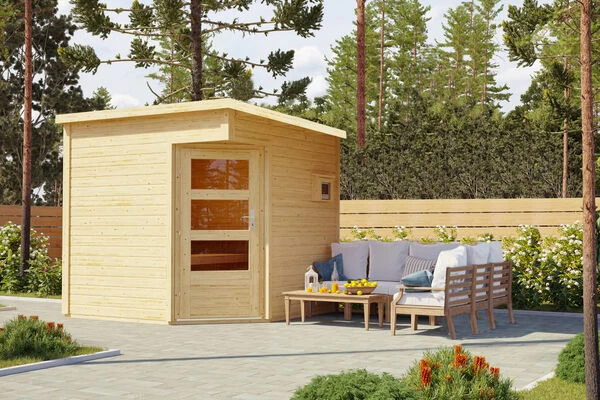 Saunahaus Pelle aus Fichtenholz mit einem Vorraum, in verschiedenen Ausführungen von KARIBU