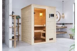 Die KARIBU 38 mm Sauna Sandra mit Fronteinstieg ist ideal für niedrige Deckenhöhen geeignet. Das Modell verfügt über eine Grundfläche von ca. 1,8 m² und einem umbauten Raum von ca. 3,2 m³. Das Außenmaß beträgt nur ca. 145 x 145 x 187 cm, das Innenmaß ca. 135 cm x 135 x 180 cm. Die Sauna wird mit Wandbrettern im Steck-/Schraubsystem gefertigt und kann somit rasch und einfach aufgebaut werden.