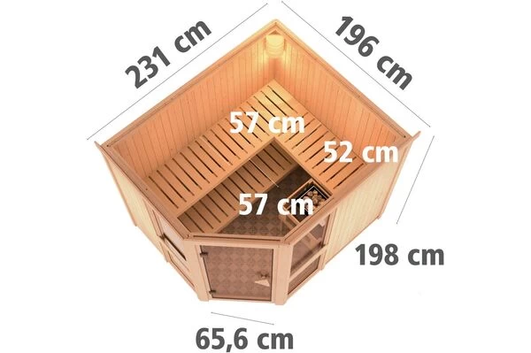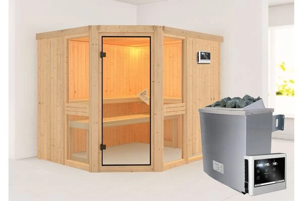 KARIBU Ecksauna Amelia 3 mit Eckeinstieg und diversen Ofen-, Steuerung- und Kranzoptionen