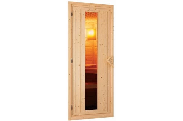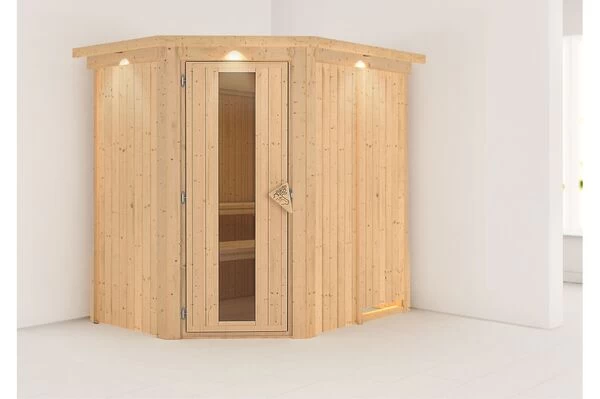 KARIBU Ecksauna Saja mit Eckeinstieg und diversen Tür-, Ofen-, Steuerung- und Kranzoptionen