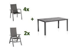 Bei dieser Esstischgruppe treffen hochwertige Materialien und Design auf modernste Weise aufeinander. Das Set besteht aus einem innovativen Esstisch der Marke KETTLER mit den Maßen von ca. 160 x 90 x 74 cm, 4 Stapelsessel und 2 Multipositionssessel der Marke KETTLER.