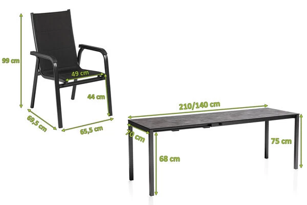 Bei dieser Esstischgruppe treffen hochwertige Materialien und Design auf modernste Weise aufeinander. Das Set besteht aus einem innovativen Ausziehtisch mit den Maßen von ca. 140/210×70 cm und 6 Stapelsesseln der Marke Kettler aus der Serie „Basic Plus Padded“.