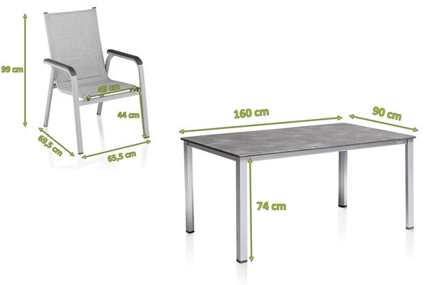 KETTLER Cubic/BasicPlus Padded Esstischgarnitur, silber/anthrazit/hellgrau, Alu/Textilene, ca. 160×90 cm, 6 Stapelsessel