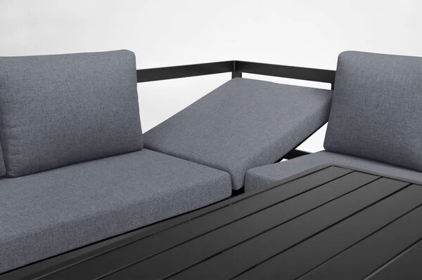 Das hochwertige Aluminium-Gestell der Casual-Dining-Gruppe sorgt für Stabilität und Langlebigkeit. Zusätzlich runden die formstabilen Kissen in Grau den trendigen Look ab. Das reduziertes Design im urbanen Einrichtungsstil vereint sich so mit einem hohen Komfortfaktor. Die Esstisch-Gruppe Ocean besteht aus einem Dining-Eck-Set inkl. Tisch und Bank. Das Eckmodul der Lounge verfügt über eine Liege-Funktion und gibt dem ganzen einen raffinierten Schub an Bequemlichkeit.
