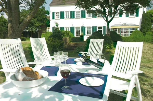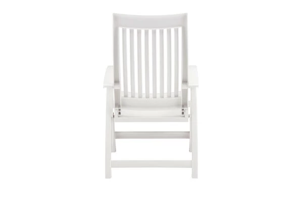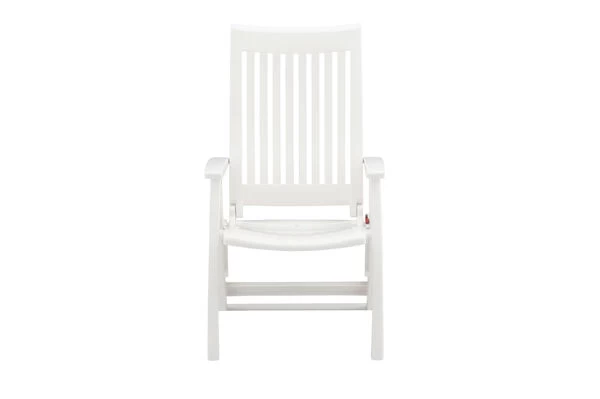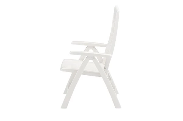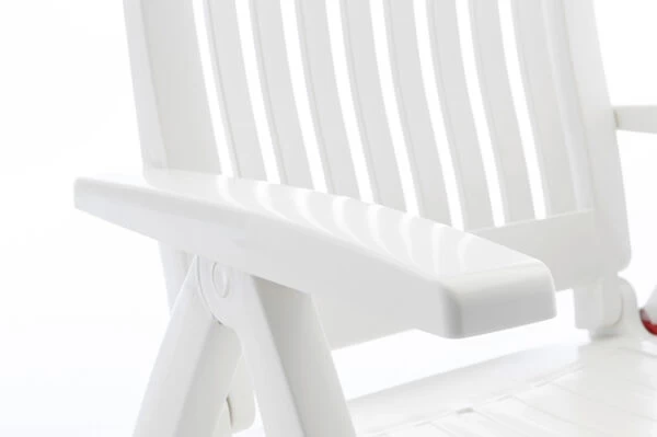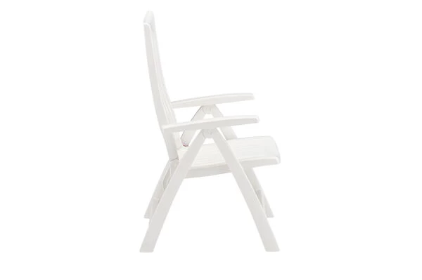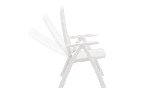 Mit dem Multipositionssessel Roma bequem durch den Sommer. Mittels Rasterschiene lässt sich der Sessel leicht in 4 verschiedene Positionen bringen – so wird der Komfort eines Liegestuhls direkt integriert. Das solide und formschöne Gestell besteht aus edlem, weißem Vollpolymer. Die Sitzfläche und Rückenlehne sind ebenfalls aus weißem Vollkunststoff gefertigt. Das leichte Material ist formstabil und trotzdem sehr bequem und zusätzlich UV- und sonnenölbeständig – insgesamt also der perfekte Begleiter in Ihrem Garten. Dank der leichten Materialien und des Klappmechanismus lässt sich der Stuhl leicht handhaben – wenn er nicht benötigt wird können Sie ihn platzsparend verstauen.