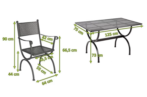 Das MBM Romeo Set für 2 Personen überzeugt durch hervorragende Verarbeitung und eine ganz besondere Optik. Das Set besteht aus einem Esstisch mit den Maßen von ca. 125 x 75 x 73 cm und 2 Stühlen mit den Maßen von ca. 64 x 55 x 90 cm der Serie Romeo von MBM. Die zeitlose Form, robust und filigran zugleich, kombiniert die hohen Ansprüche moderner Möbel mit klassischem Design. Verspielte Details wie die abgerundeten Armlehnen und die Zierkugeln an der Rückenlehne machen den Sessel zu einem echten Blickfang. Das aufwendig von Hand geschmiedete Eisengestell zeichnet sich durch seine hohe Stabilität und Haltbarkeit aus und kann mit bis zu ca. 110 kg belastet werden. Zu den prägenden Elementen der Romeo-Serie zählen unter anderem die geschwungene Konstruktion und die gelochten Flächen. Das aufwendig von Hand geschmiedete Eisengestell zeichnet sich durch seine hohe Stabilität und Haltbarkeit aus. Es wurde in einem aufwendigen Verfahren verzinkt und anschließend in Marone pulverbeschichtet. Dadurch ist der Gartentisch gegen äußere Witterungseinflüsse optimal geschützt und eignen sich perfekt für den Outdooreinsatz.