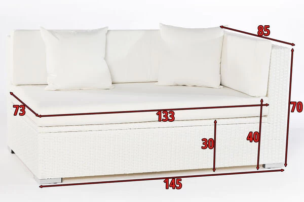 Ob als Bestandteil einer Gartenlounge oder als Balkonmöbel: Dieses Modulelement bietet Ihnen die beste Grundlage für Ihre individuelle Gartengestaltung. Das 2-Sitzer-Sofa mit linker Armlehne ist absolut wetterfest und äußerst pflegeleicht. Extreme Temperaturen zwischen -60°C und +70°C können der Polyrattanfaser nichts anhaben. Das Sofa verfügt über edle Aluminiumfüße, die dank der Kunststoffnoppen Ihren Bodenbelag schonen und einen schönen Kontrast zur flachen Polyrattanfaser bilden. Dieses Gartensofa bietet Ihnen mit seiner bequemen Polsterung besten Komfort, um stundenlang relaxen zu können. Das Sofa ist insgesamt mit bis zu ca. 300 kg belastbar. Die Sitzfläche lässt sich hochklappen. Der Stauraum darunter ist mit einer wasserdichten Kissentasche ausgestattet, die mittels Reißverschluss geschlossen wird. Alle Polster lassen sich so sicher und problemlos verstauen. Einzelne Modulelemente bieten zudem den praktischen Vorteil, Ihre Gartenlounge bei Bedarf zu erweitern und immer wieder neu anzuordnen.