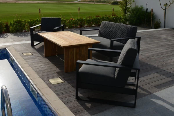 Die Wetterbeständigkeit und Pflegeleichtigkeit der verwendeten Materialien sorgen für den nötigen Schutz bei Wind und Wetter. Das Gestell aus pulverbeschichtetem Aluminium ist ebenfalls widerstandsfähig gegen jegliche Umwelteinflüsse und ermöglicht es Ihnen das ganze Jahr über Ihre Möbel auf der Terrasse zu genießen.