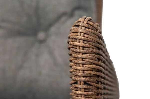 Das Untergestell des Möbelstücks besteht aus pulverbeschichtetem Aluminium, dies macht es nicht nur stabil, sondern sorgt auch dafür, dass es sich aufgrund des relativ geringen Gewichts von ca. 11,5 kg je Sessel ganz leicht hin und her stellen lässt. Das Aluminiumgestell wird mit Polyrattangeflecht bespannt. Das runde Geflecht ist in der Farbe hellbraun (Faser w18, Nature Exclusive Line) gehalten und der natürlichen Rattan-Faser nachempfunden – dies sorgt für einen sehr natürlichen und mediterranen Look. So passt diese Line wunderbar zu allen möglichen Terrasseneinrichtungen. Das gemütliche Sitz- und Rückenpolster (100 % Olefin (200 g/m³)) mit einer Stärke von ca. 5 cm sorgt für höchsten Sitzkomfort. Farblich ist das grau melierte Polster perfekt auf das Geflecht abgestimmt. Die synthetische Faser Olefin wird für ihre Hitzebeständigkeit und optimalen Trage- und Pflegeeigenschaften geschätzt. Sollten Sie einmal Falten in Ihren Polstern haben, werden diese bei Wärme von alleine verschwinden, sodass die Bezüge komplett bügelfrei sind. Textilien aus Olefin sind bequem, hautkühlend, waschbar und bügelfrei. Sie eignen sich perfekt für den Einsatz im Freien, was nicht zuletzt an ihrer wasserabweisenden und atmungsaktiven Materialzusammensetzung liegt.