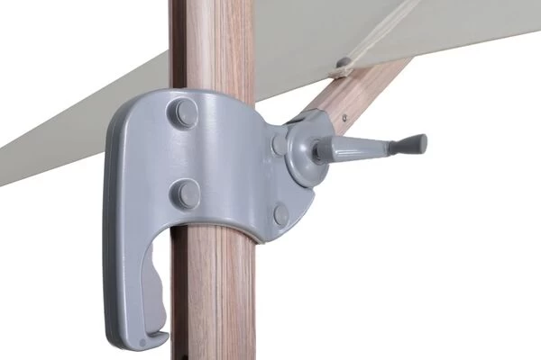 | Kurbelsystem Mit der im Griffteil eingearbeiteten Kurbelmechanik können Sie den Schirm ganz einfach öffnen und schließen. Des Weiteren können Sie hiermit die Dachneigung komfortabel einstellen. | |