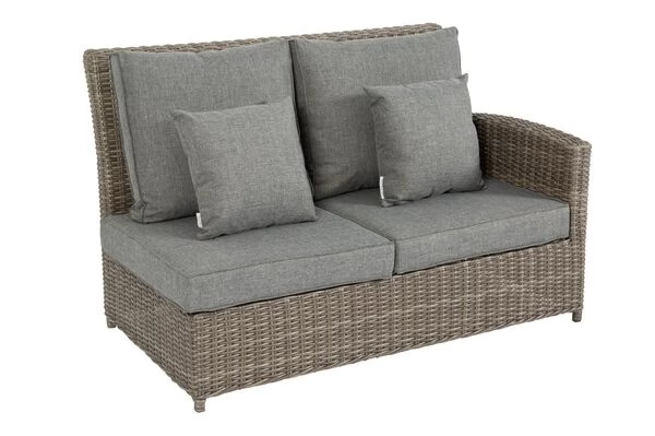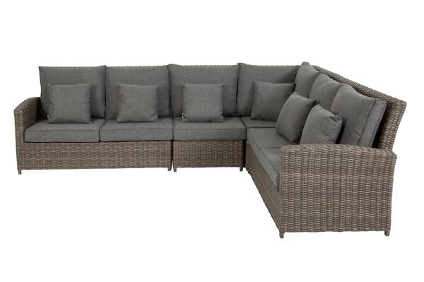 Diese gemütliche Loungegruppe von OUTFLEXX® bietet bequem bis zu sechs Personen Platz. Die Sitzhöhe von ca. 30 cm (ohne Kissen) macht die Lounge zum Allround Talent – hier können Sie gemütlich in der Sonne liegen, aber auch ganz bequem ein leckeres Abendessen zu sich nehmen. Das Set besteht aus zwei 2er Sofas (ca. 137 x 82,5 x 90 cm), einem Eckelement (ca. 82,5 x 82,5 x 90 cm) und einem einzelnen Mittelelement (ca. 65 x 82,5 x 90 cm), so können Sie die Schenkellänge flexibel wählen und die Lounge bequem an Ihre Gegebenheiten zuhause anpassen.