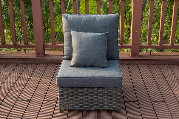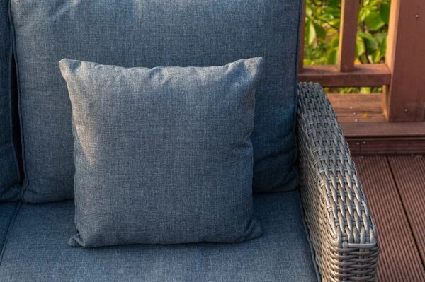 Das Untergestell der Möbel besteht aus pulverbeschichtetem Aluminium, dies macht es nicht nur stabil, sondern sorgt auch dafür, dass es sich aufgrund des relativ geringen Gewichts von insgesamt ca. 68,4 kg ganz leicht hin und her stellen lässt. Das Aluminiumgestell wird mit Polyrattan bespannt. Das halbrunde Geflecht ist in der Farbe grau (Faser w5) gehalten und passt so wunderbar zu allen möglichen Terrasseneinrichtungen. Die gemütlichen Polster (100 % Olefin (200 g/m³)) mit einer Stärke von ca. 10 cm sorgen für höchsten Sitzkomfort. Farblich sind die grau melierten Polster perfekt auf das Geflecht abgestimmt. Die synthetische Faser Olefin wird für ihre Hitzebeständigkeit und optimalen Trage- und Pflegeeigenschaften geschätzt. Sollten Sie einmal Falten in Ihren Polstern haben, werden diese bei Wärme von alleine verschwinden, sodass die Bezüge komplett bügelfrei sind. Textilien aus Olefin sind bequem, hautkühlend, waschbar und bügelfrei. Sie eignen sich perfekt für den Einsatz im Freien, was nicht zuletzt an ihrer wasserabweisenden und atmungsaktiven Materialzusammensetzung liegt.