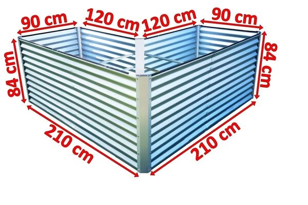 Das silberfarbene Hochbeet aus dem Material Zincalume hat die Maße von ca. 210 x 210 x 90 x 84 cm und ist dank seiner besonderen Eck-Form auch zum optischen Eingrenzen, beispielsweise von der Terrasse, bestens geeignet. Die Gummi-Ummantelung am oberen Rand des Hochbeets sorgt für ein sicheres Arbeiten am Hochbeet und die 6 nicht sichtbaren Querstreben im Hochbeet sorgen für zusätzliche Stabilität. Beim Werkstoff „Zincalume“ handelt es sich um ein mit Zink und Aluminium beschichtetes Stahlblech, das durch die Beschichtung jahrelang resistent gegen Umwelt- und Witterungseinflüsse ist. Seine Lebensdauer ist vier mal länger als bei galvanisiertem Stahl.