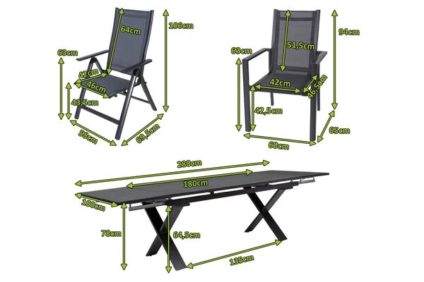 OUTFLEXX® Esstischgarnitur aus Aluminium/Textilene in anthrazit, Ausziehtisch 180/280x100x78cm und 8 Stapel-/Multipositionssessel