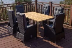 Die gemütlichen Diningsessel sind wahrlich Verwandlungskünstler. Hier können Sie gemütlich mit einem guten Buch in der Sonne liegen oder aber auch ganz bequem Ihr Mittag- oder Abendessen zu sich nehmen. Hierzu brauchen Sie einfach nur Platz zu nehmen und sich Ihren Lieblingssessel problemlos in eine bequeme Liege- oder Sitzposition einstellen. Dies gelingt kinderleicht dank der integrierten Gasdruckfeder – die Rückenlehne kann mit einem kleinen Hebel an der Seite stufenlos verstellt werden. Die Sessel haben ein Gesamtmaß von ca. 65 x 55 x 112 cm. Die Sitzfläche ist ca. 50 cm tief, die Sitzhöhe mit Kissen liegt bei ca. 45,5 cm. Die Armlehnen mit einer Höhe von ca. 66 cm sorgen bei diesen Sesseln für besonderen Komfort.