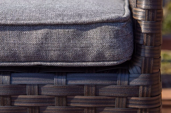Das flache Polyrattangeflecht ist in der Farbe braun (Faser w3) gehalten und bildet so ein harmonisches Zusammenspiel von Tisch und Sessel! Gemütliche Sitz- und Rückenpolster (100 % Olefin (200 g/m³)) mit einer Stärke von ca. 5 cm sorgen für höchsten Sitzkomfort. Farblich sind die grau melierten Polster perfekt auf das Geflecht abgestimmt. Die synthetische Faser Olefin wird für ihre Hitzebeständigkeit und optimalen Trage- und Pflegeeigenschaften geschätzt. Sollten Sie einmal Falten in Ihren Polstern haben, werden diese bei Wärme von alleine verschwinden, sodass die Bezüge komplett bügelfrei sind. Textilien aus Olefin sind bequem, hautkühlend, waschbar und bügelfrei. Sie eignen sich perfekt für den Einsatz im Freien, was nicht zuletzt an ihrer wasserabweisenden und atmungsaktiven Materialzusammensetzung liegt.