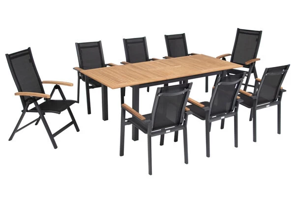 OUTFLEXX® Esstischgarnitur aus Aluminium/Textilene in schwarz, Ausziehtisch 152/210x89x74,5cm und 8 Stapel-/Multipositionssessel mit recyceltem FSC®-Teakholz