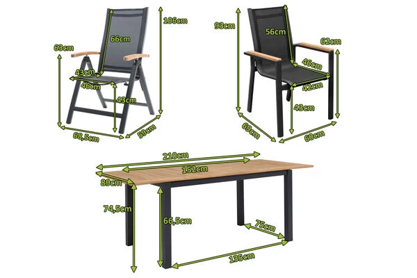Mit Gesamtmaßen von ca. 152/210 x 89 x 74,5 cm ist der ca. 28,25 kg schwere Tisch auch sehr stabil. Die ca. 2 cm dicke Tischplatte aus wiederverwertetem Teakholz macht diesen wunderschönen Tisch zum Blickfang in Ihrem Garten oder auf Ihrer Terrasse. Die natürliche Wärme des Holzes verleiht ihm einen ganz besonderen Charme, der von der allmählichen Patinabildung in einem schönen Silbergrau noch unterstrichen wird. Wenn Sie der Patinabildung jedoch entgegen wirken möchten empfehlen wir Ihnen eines unserer Pflegeöle, welches Sie im Zubehör finden. Alle Gestelle sind solide gearbeitet und bestehen aus korrosionsbeständigem Aluminium im schicken “anthrazit matt”. Die Sitz- und Rückenflächen der Sessel sind mit Textilene im passenden Schwarzton bespannt. Das Material ist unglaublich hautsympathisch und sorgt für ein herrlich luftiges Sitzgefühl, das Sie auch in der Sommerhitze nicht im Stich lässt. Hautschmeichelnde Armlehnen – aus gebürstetem, natürlichen Teakholz – schenken den Sesseln erhöhten Komfort. Die Gesamtmaße der Stapelsessel liegen jeweils bei ca. 69 x 60 x 93 cm mit einem Gewicht von ca. 3,9 kg. Die Multipositionssessel wiegen jeweils ca. 5,05 kg bei Maßen von ca. 68,5 x 59 x 106 cm. Alle Sessel sind dank der hohen Qualität und erstklassigen Verarbeitung bis ca. 120 kg belastbar. Natürlich können Sie die Sitzmöbel auch kinderleicht stapeln oder zusammenklappen und bis zum nächsten Einsatz verstauen.