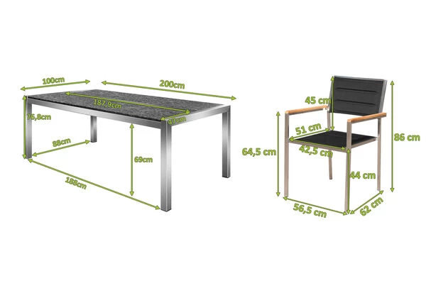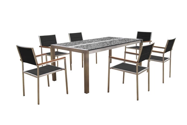 OUTFLEXX Esstischgarnitur, silber/anthrazit, Edelstahl/Granit/Textil, 200×100 cm, 6 Stühle, padded, Teakarmlehnen