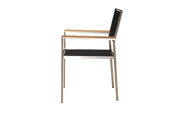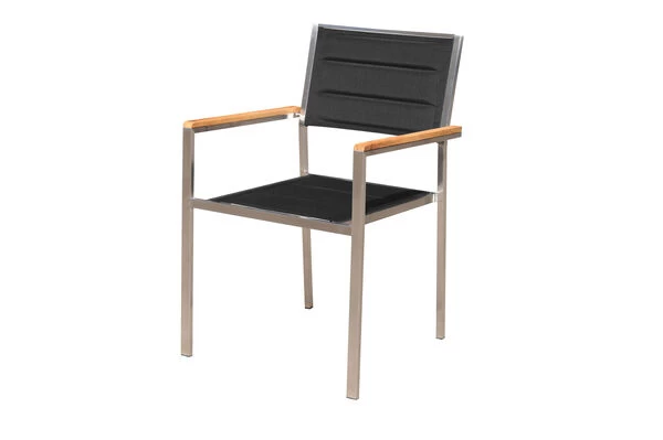 Dieser zeitlose Stuhl besitzt eine Bespannung aus hochwertigem Textilen hergestellt aus 75% Polyvinylchlorid und 25% Polyester. Das witterungsbeständige Material ist durch seine Flexibilität und seine zusätzliche Polsterung (padded) auch ohne Auflagen sehr bequem. Das formstabile Gewebe nimmt kein Wasser auf, ist atmungsaktiv und trocknet nach einem kurzen Schauer sehr schnell. Das sorgfältig verarbeitete Gestell aus rostfreiem 304er Edelstahl ist ebenfalls besonders witterungsbeständig und hält wie die anderen Materialien dieses Stuhls sowohl Frost und Hitze als auch Feuchtigkeit und Regen aus. Das für die Armlehnen verwendete Teakholz ist FSC-zertifiziert und stammt damit aus verantwortungsvollen Quellen. So können Sie sich guten Gewissens zurücklehnen und sich so richtig entspannen. Die hochwertigen Materialien und die sorgfältige Verarbeitung sorgen nicht nur für die besondere Optik dieses Stuhls, sondern machen ihn mit einer Belastbarkeit von ca. 150 kg sehr stabil. Dank der schwarzen Kunststoffkappen an den Stuhlbeinen ist Ihr Boden geschützt. Nachdem die Gäste sich auf den Weg gemacht haben, können Sie die Stühle einfach stapeln und damit platzsparend verstauen.