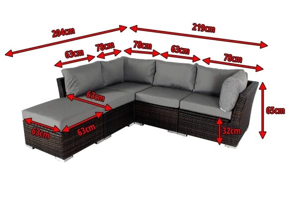 Die Sitzgruppe besteht aus zwei 1-Sitzer-Mittelelementen, zwei 1-Sitzer-Eckelementen sowie einem Hocker mit einem Sitzpolster. So dient der Hocker entweder als zusätzliche Sitzgelegenheit mit Sitzposter oder als Tisch. Die hochwertigen ca. 10 cm dicke Polster mit ihren wasserabweisenden Bezügen aus 100% Polyester sorgen für einen sehr angenehmen Sitzkomfort, so dass sich hier gemütliche Stunden mit der Familie oder Freunden verbringen lassen. Die einzelnen Sitz-Elemente sind jeweils mit bis zu ca. 150 kg belastbar. Die Sitzflächen der Möbel lassen sich hochklappen. Der Stauraum darunter ist jeweils mit einer wasserdichten Kissentasche ausgestattet, die mittels Reißverschluss geschlossen wird. Alle Polster lassen sich so sicher und problemlos verstauen.
