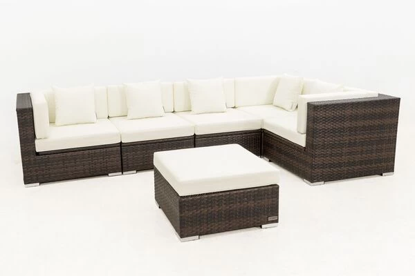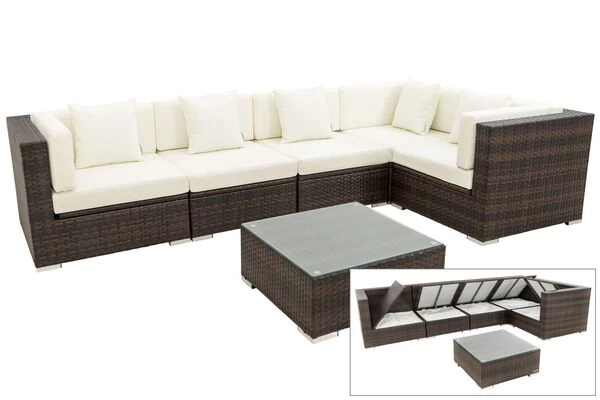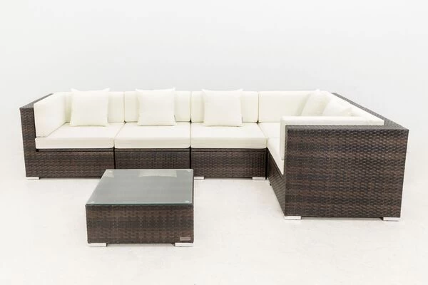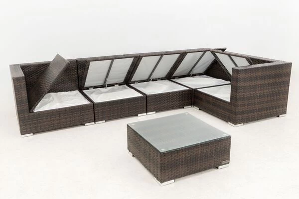 Diese gemütliche Loungegruppe besteht aus 6 Modulen, die Sie beliebig anordnen können. Sie bestimmen somit selbst, wie sich die Möbel auf Ihrer Terrasse am besten präsentieren. Ihre neuen Gartenmöbel sind äußerst pflegeleicht und strapazierfähig, da die verwendete flache Faser sowohl Hitze und Frost als auch UV-Strahlen, Salzwasser und Chlor unbeschadet hinnimmt und nichts von ihrer ursprünglichen Schönheit einbüßt. Im Inneren befindet sich ein rostfreies Aluminiumgestell, welches für die nötige Stabilität sorgt und aufgrund des geringen Gewichts einen einfachen Platzwechsel ermöglicht. Der Sessel und das Mittelelement sind jeweils mit bis zu ca. 150 kg belastbar. Alle Module verfügen über edle Aluminiumfüße, die dank der Kunststoffnoppen Ihren Bodenbelag schonen und einen schönen Kontrast zur Polyrattanfaser bilden.