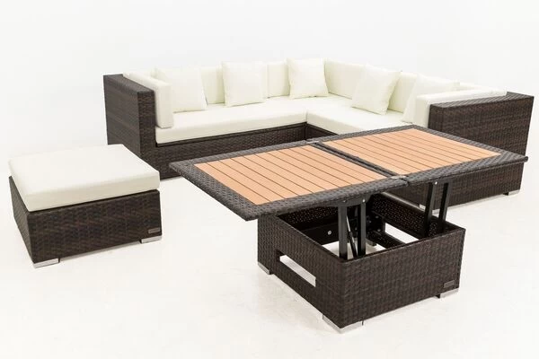 Laden Sie doch einmal wieder Freunde und Familie zu sich nach Hause ein und genießen Sie das Zusammensein. Mit dieser Sitzgruppe aus braun marmoriertem flachen Polyrattan haben Sie zukünftig Platz für bis zu 6 Personen und einem entspannten Familiensonntag oder dem spannend spaßigen Spieleabend mit Freunden steht nichts mehr im Wege.