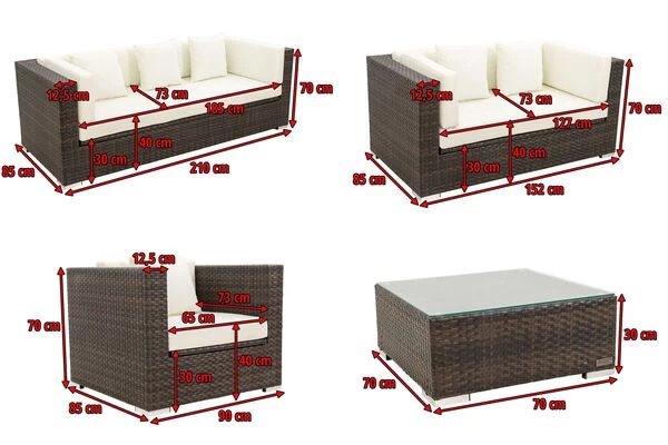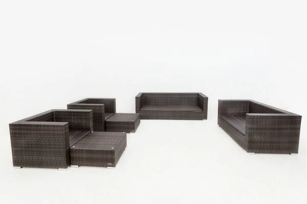 Diese gemütliche Loungegruppe besteht aus 6 Modulen, die Sie beliebig anordnen können. Sie bestimmen somit selbst, wie sich die Möbel auf Ihrer Terrasse am besten präsentieren. Ihre neuen Gartenmöbel sind äußerst pflegeleicht und strapazierfähig, da die verwendete flache Faser sowohl Hitze und Frost als auch UV-Strahlen, Salzwasser und Chlor unbeschadet hinnimmt und nichts von ihrer ursprünglichen Schönheit einbüßt. Im Inneren befindet sich ein rostfreies Aluminiumgestell, welches für die nötige Stabilität sorgt und aufgrund des geringen Gewichts einen einfachen Platzwechsel ermöglicht. Der 1-Sitzer ist mit bis zu ca. 150 kg belastbar, beim 2-Sitzer Sofa sind es ca. 300 kg und beim 3-Sitzer sogar ca. 450 kg. Alle Module verfügen über edle Aluminiumfüße, die dank der Kunststoffnoppen Ihren Bodenbelag schonen und einen schönen Kontrast zur Polyrattanfaser bilden.