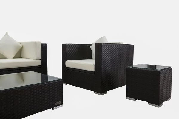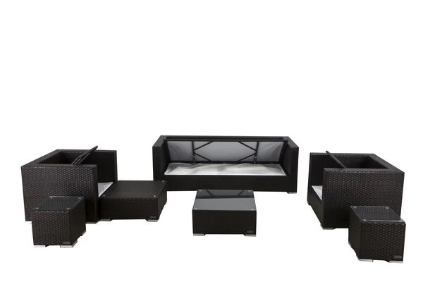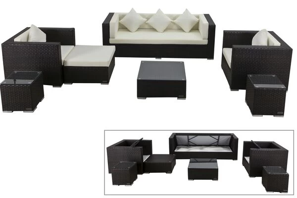 Die Sitzgruppe umfasst ein großes 3-Sitzer-Sofa, zwei Sessel, zwei kleine Beistelltische sowie zwei Hocker, die Sie dank der mitgelieferten Glasplatten auch als Kaffeetisch nutzen können. Damit ist Ihre Terrasse direkt vollständig ausgestattet. Die hochwertige und wertbeständige Sitzgruppe bietet bis zu sechs Personen einen bequemen Sitzplatz. Hitze und Frost hält die strapazierfähige, flache Polyrattanfaser ebenso stand wie Salzwasser, Chlor und UV-Strahlen. Die Polster der Loungemöbel verfügen über hochwertige Bezüge aus 100% Polyester (300g/m²), die wasserabweisend beschichtet sind und sich angenehm auf der Haut anfühlen.