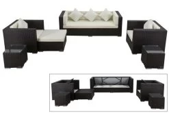 Die Sitzgruppe umfasst ein großes 3-Sitzer-Sofa, zwei Sessel, zwei kleine Beistelltische sowie einen Hocker, den Sie dank der mitgelieferten Glasplatte auch als Tisch nutzen können. Damit ist Ihre Terrasse direkt vollständig ausgestattet. Die hochwertige und wertbeständige Sitzgruppe bietet bis zu sechs Personen einen bequemen Sitzplatz. Hitze und Frost hält die strapazierfähige, flache Polyrattanfaser ebenso stand wie Salzwasser, Chlor und UV-Strahlen. Die Polster der Loungemöbel verfügen über hochwertige Bezüge aus 100% Polyester (300g/m²), die wasserabweisend beschichtet sind und sich angenehm auf der Haut anfühlen.